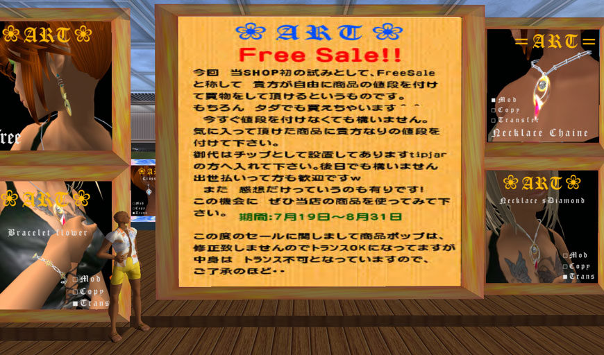 kumashonSIMにオープンしたアクセサリーショップ『ART』さんでは、明日(7月19日)から、FREE SALEと称して、面白い試みをなさいます。